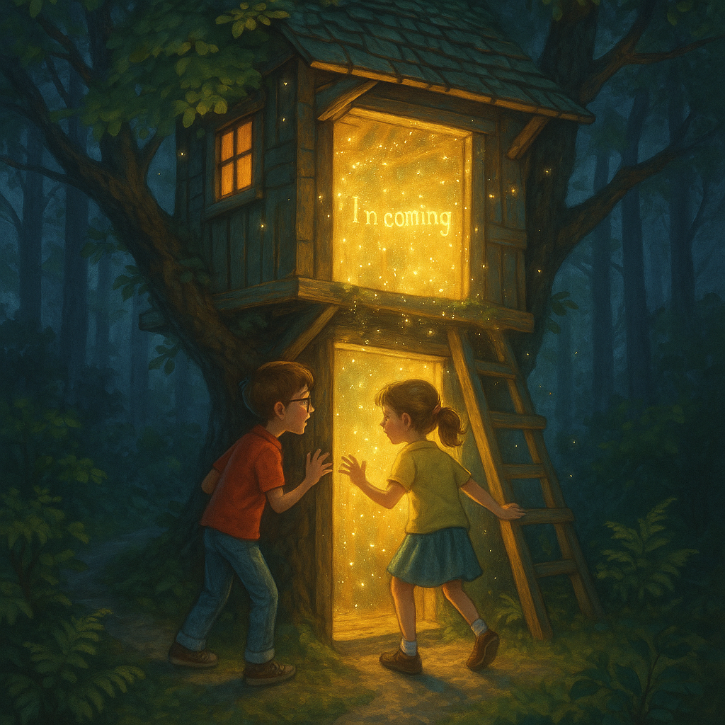 Two kids entering a glowing, magical treehouse nestled in a large leafy tree at sunset