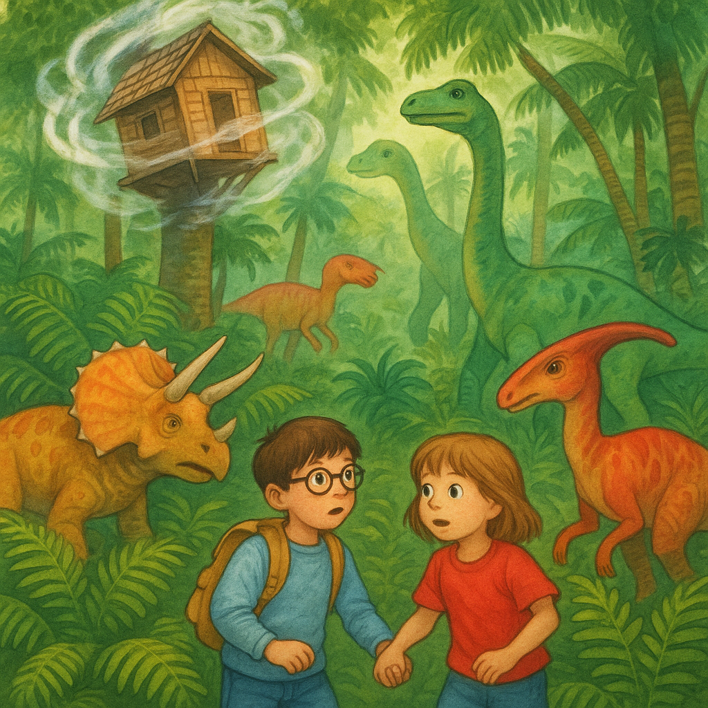 The treehouse spins and shakes, landing deep in a thick jungle filled with giant ferns. Jack and Annie see colorful dinosaurs roaming nearby. They hold hands tightly, ready to explore this strange new world.