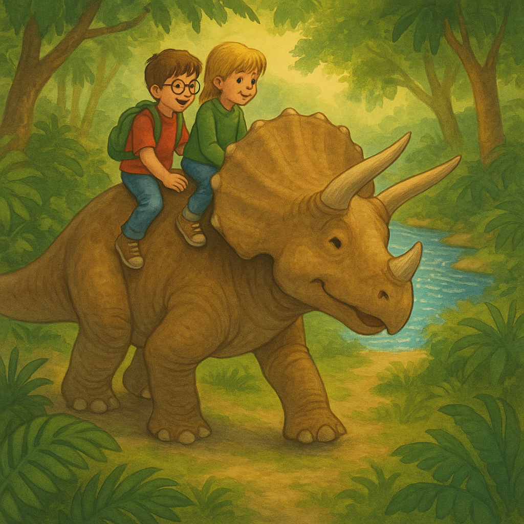 A gentle triceratops approaches Jack and Annie. It lets them climb onto its back for a ride through the jungle. The dinosaur helps the kids find a sparkling river where they can rest and learn about prehistoric plants.